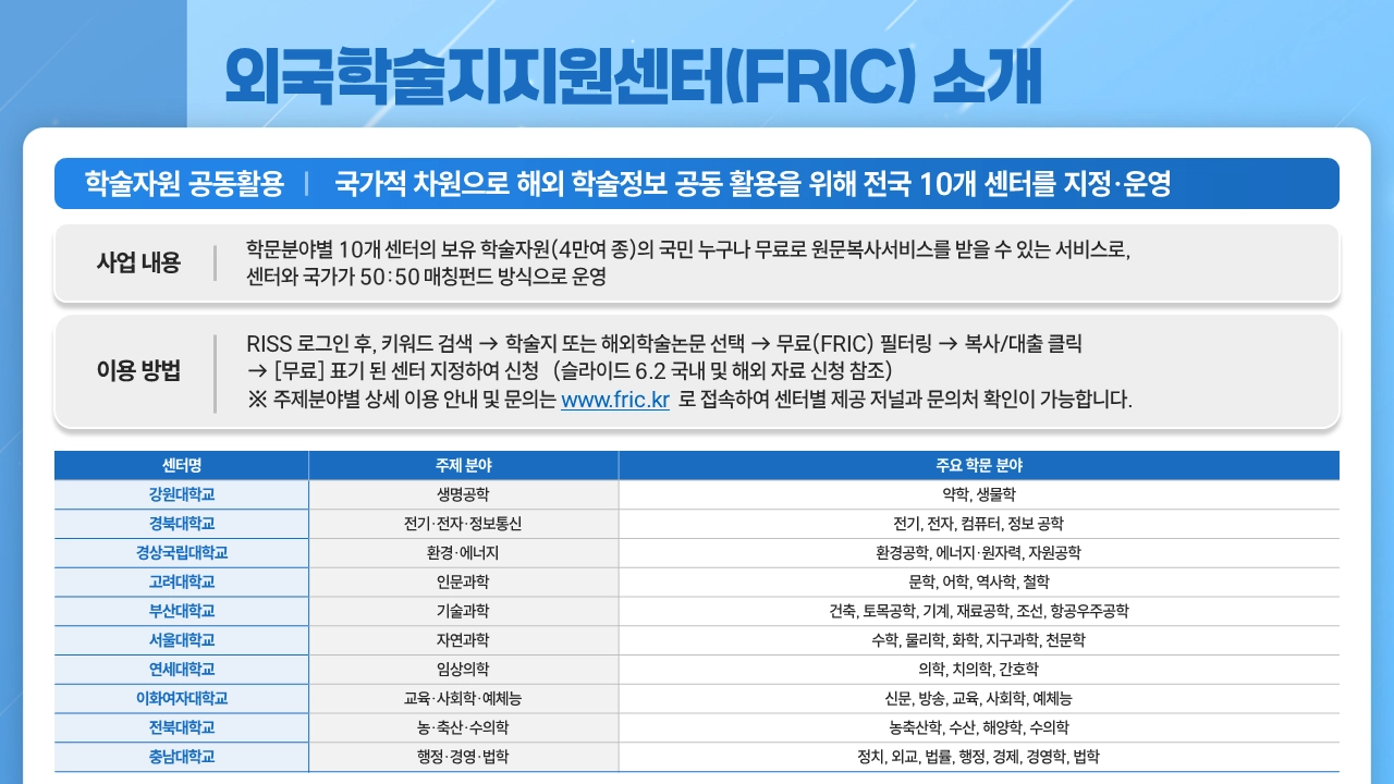 외국학술지의 수집·보존·활용을 위해 교육부가 지원하고 한국교육학술정보원(KERIS)이 주관하는 국가 사업입니다. 행정, 경영, 법학 분야의 외국학술지를 수집하고, 무료 원문 제공을 통해 학술정보 공동 활용과 국가 연구 경쟁력 향상에 기여합니다.