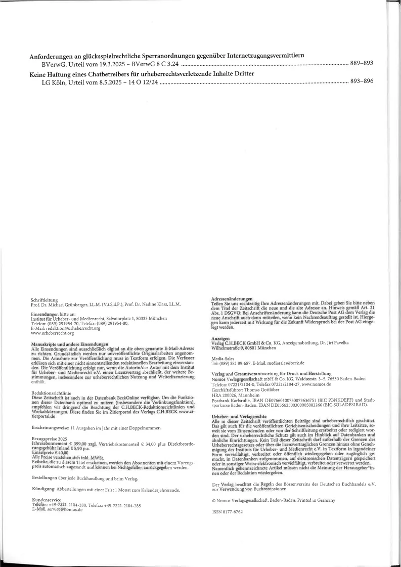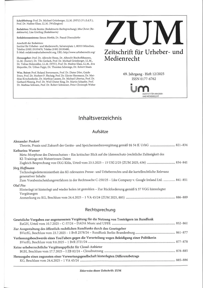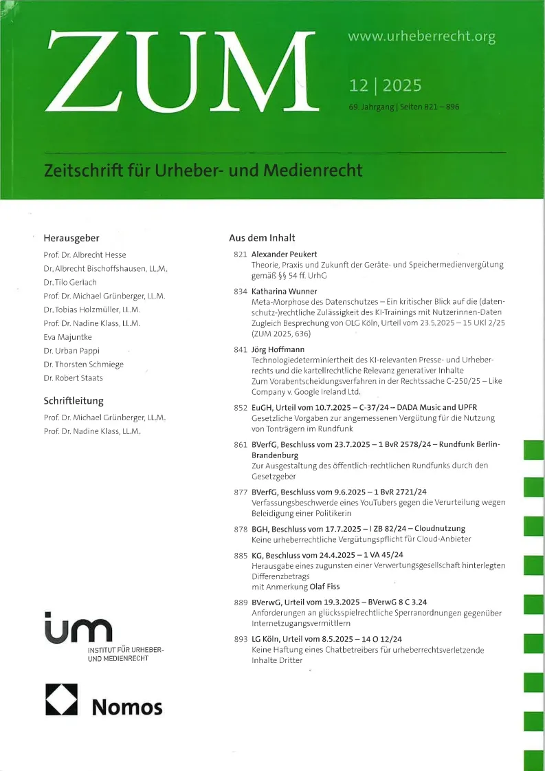 ZUM - Zeitschrift fuer Urheber- und Medienrecht - without Supplement = ohne Beiheft